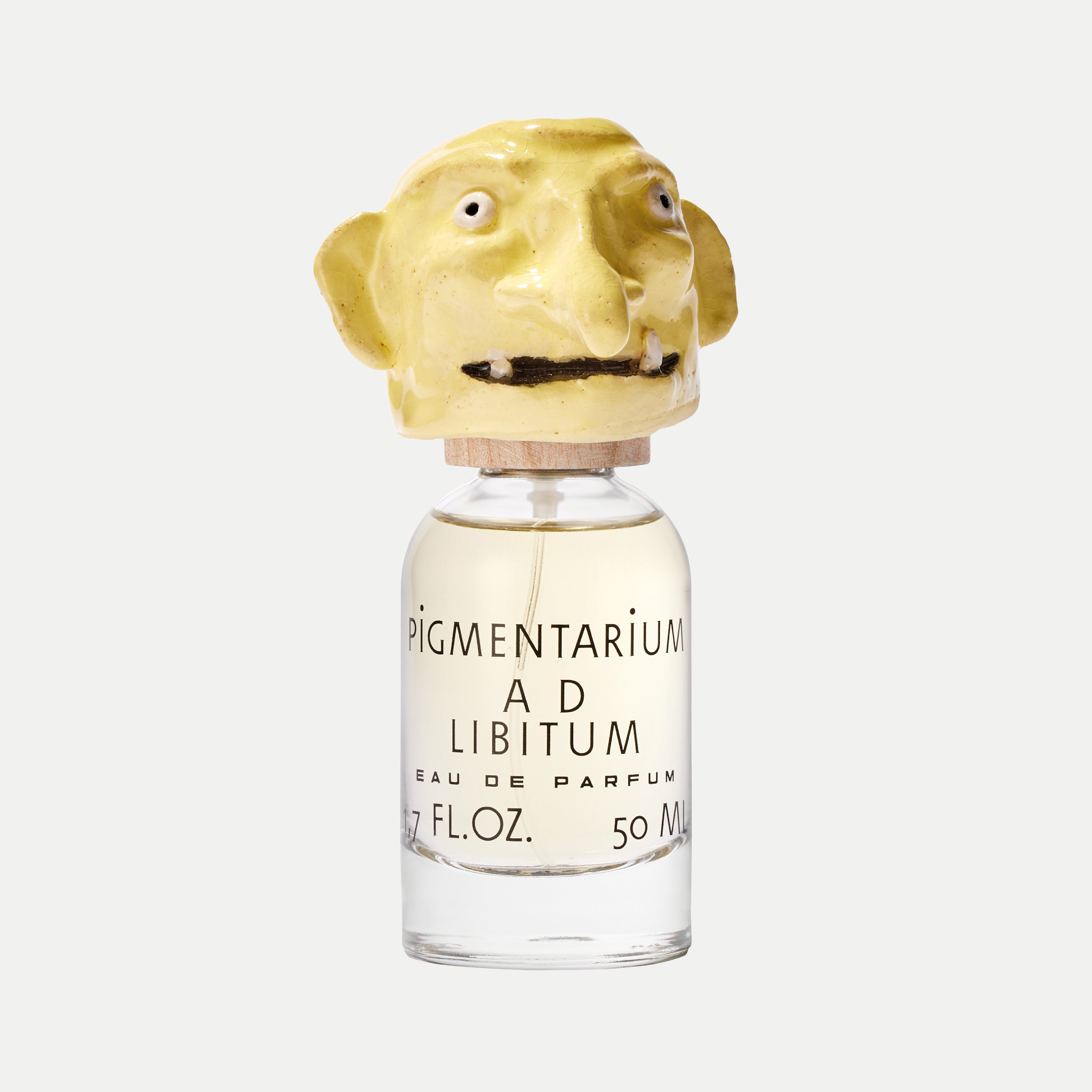Atelier Šunčík x Pigmentarium. Keramická hlava pevně spojená s tradičním dřevěným víčkem parfémů Pigmentarium v podobě žlutého fantoma. Jediný originální kus od Atelier Šunčík, dekorovaný ručně vyrobenými engobami z přírodních pigmentů, glazovaný.